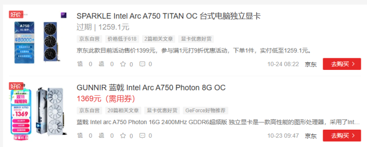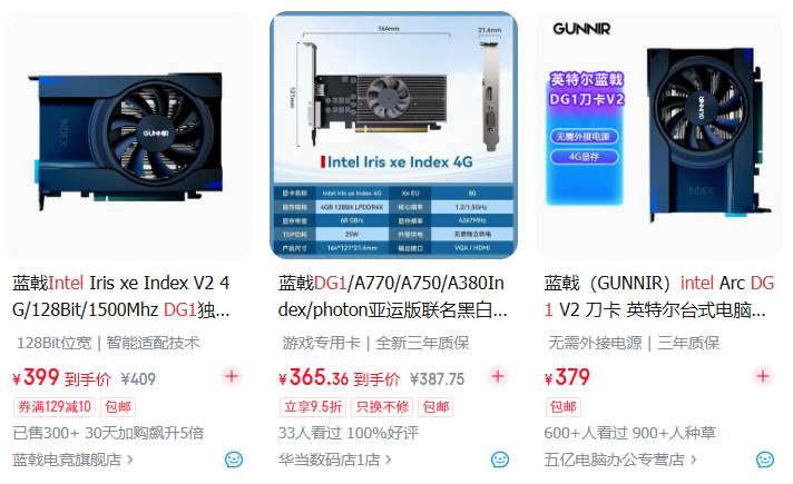 而这两款处理器在显卡选择上也很灵活,往下可以用二百块的Intel DG1——比带核显的12400 / 13400强一大截,穿越火线、英雄联盟等网游均无压力,上图是JD平台,价格有点贵,建议去小黄鱼瞅瞅,非常便宜;
