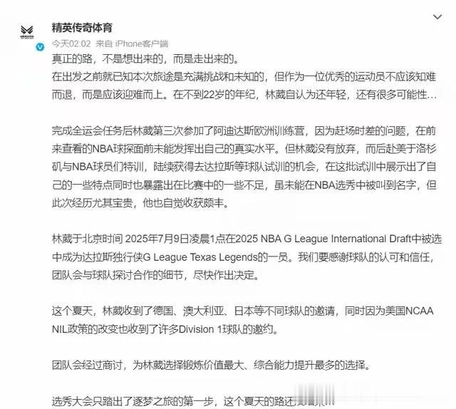 林葳,经纪公司发文觉得他应该迎难而上,年轻有很多种可能性,能够被德克萨斯传奇队选中,他们感谢球队的信任,会尽快作出决定,在这个夏天,林葳也收到了来自德国,澳大利亚,日本等不同球队的邀请,团队会经过商讨,林葳会做出锻炼,价值最大,综合能力提升最快的选择。