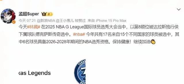 NBA发展联盟选秀传来好消息,效力于南京同曦的球员林葳,在nba,G联赛国际球员选秀中,第八顺位被独行侠下属球队德克萨斯传奇选中,同曦俱乐部官方发文表示祝贺,对于林葳是机会和挑战并存!